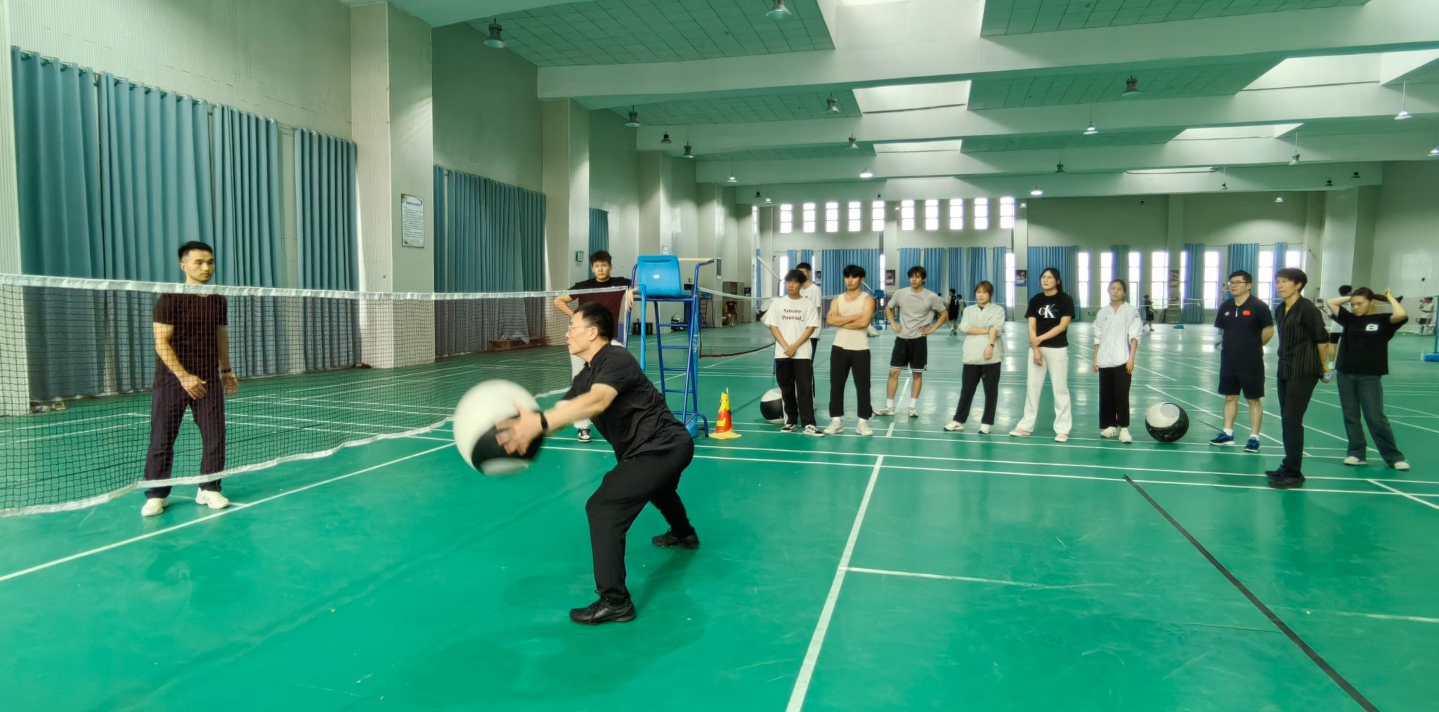 讲座结束后,在体育场馆又进行了一场太极球实践授课教学展示,杨建营亲自示范动作要领,讲解技术细节,并指导师生进行体验练习,现场互动积极,气氛活跃,师生们近距离感受了太极球运动的魅力,深化了对理论知识的理解。