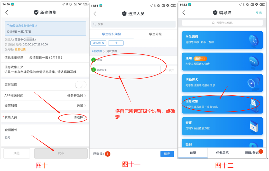 2.在“执行任务”界面中选定所带班级后,点击“发布”按钮(图十、图十一),此时信息采集任务将推送至每一位学生。辅导员通过“辅导猫”界面中的“信息收集”模块实时查看学生信息填报的进度和详细内容。(图十二)。