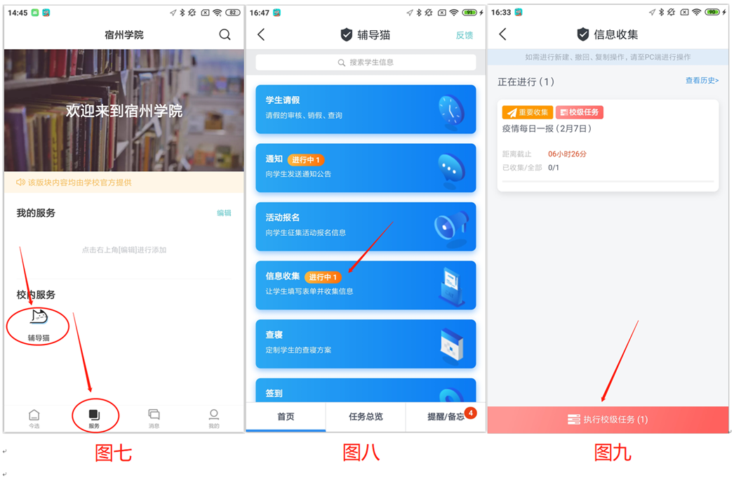 1.辅导员每日在校级管理员发起信息采集任务后(每日7:00发起),进入主界面下方的“服务”,选择“辅导猫”(图七),进入“辅导猫”界面,点击“辅导猫”界面中的“信息收集”(图八),执行当日的信息收集任务(图九)。