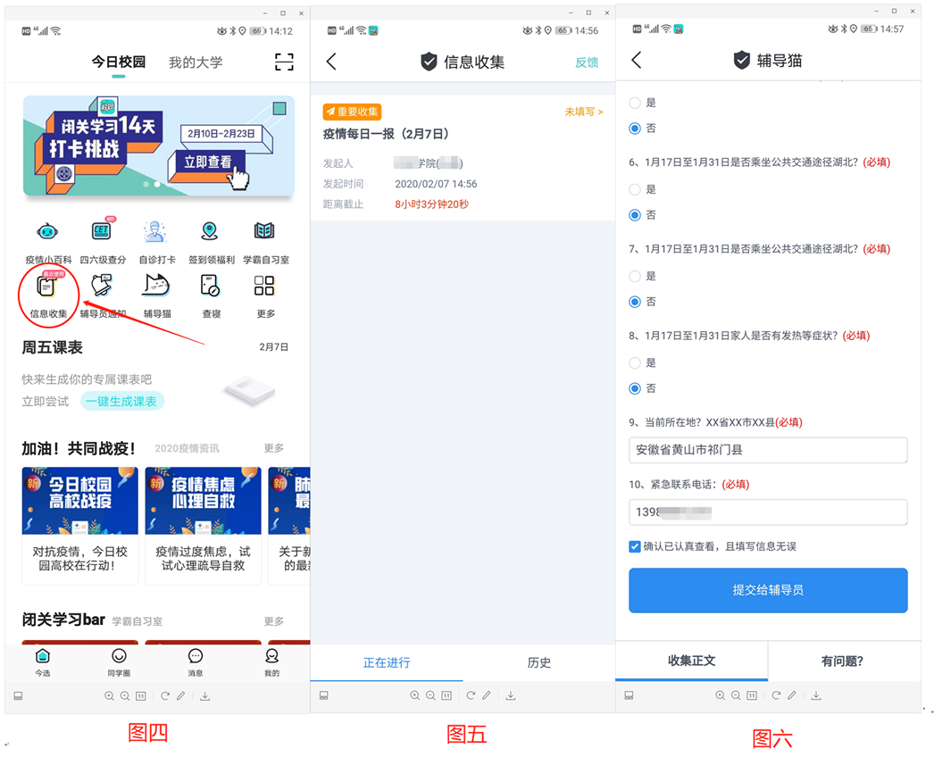 点击学生界面里的“信息收集”(图四),进入“信息收集”界面,选择当日报表(图五),填写完成并点“提交给辅导员”(图六),完成信息上报。