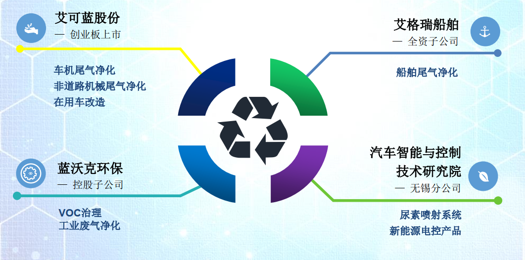 公司所处行业属于国家鼓励发展的高新技术产业和战略新兴产业。每一步的重量,见证着一个品牌的厚度;每一片天空的湛蓝,重塑着一个民族的信心。服务于排放升级和产业升级始终是艾可蓝存在的意义,让人们享受动力时代蓝天白云的中国梦是我们坚持不懈的追求。有“艾”,天可以更蓝,请您与我们一道,同扬帆、共远航,为绿色动力、绿色人居、绿色地球,唱响我们的旋律。