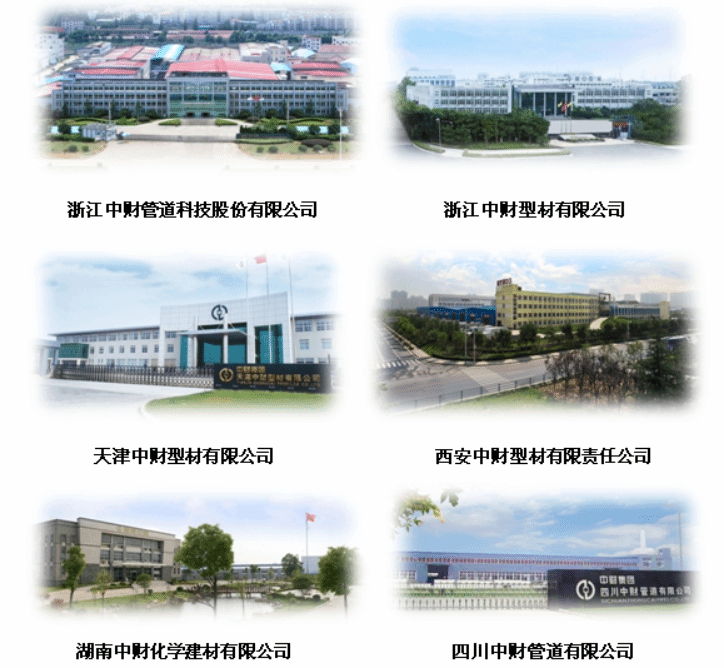 浙江中财管道科技股份有限公司是中财集团化学建材业的核心企业之一,成立于1995年,位于浙江省绍兴新昌县,注册资金2亿元,厂区面积800多亩。是一家专业生产PE、PPR、PVC塑料管道的行业龙头企业。公司现拥有员工1400余人,拥有双螺杆挤出生产线、注塑机及配套检测设备近千条,各类产品模具7000套,整体实力位居行业三甲。
