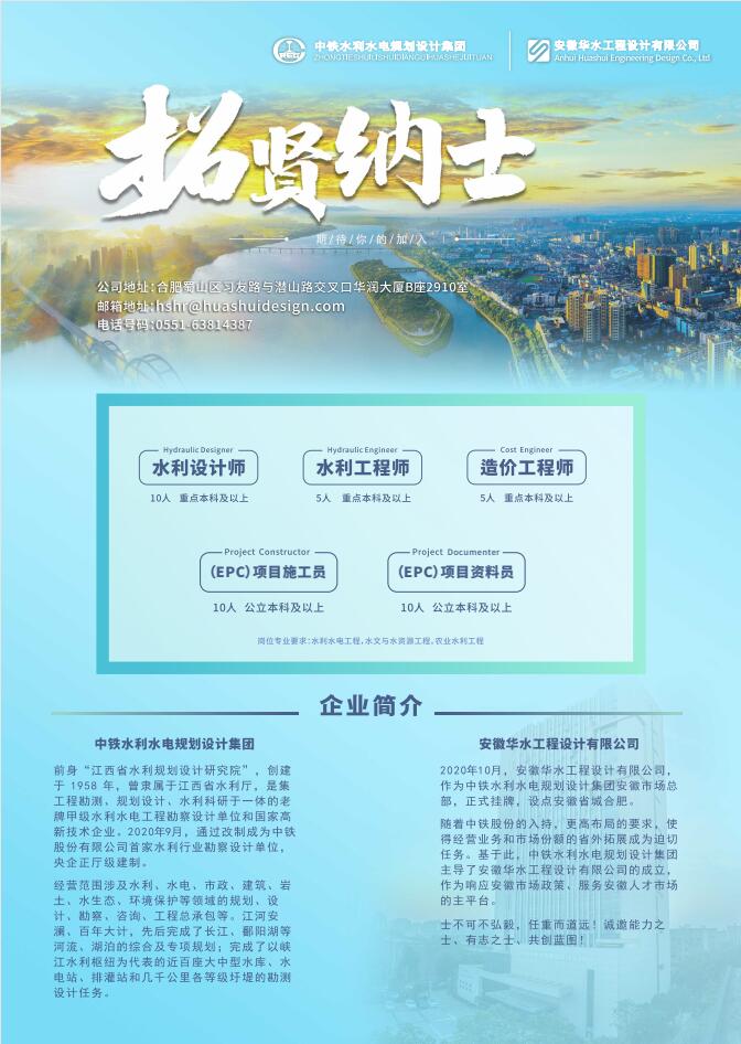 202010月,安徽华水工程设计有限公司,作为中铁水利水电规划设计集团安徽市场总部,正式挂牌,设点安徽省城合肥。