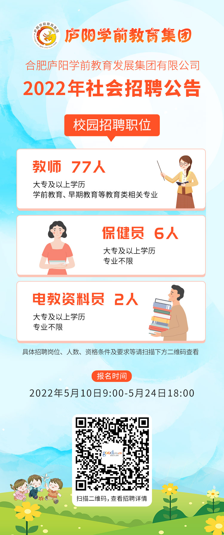 合肥庐阳学前教育发展集团有限公司(以下简称“庐阳学前教育集团”)成立于2020年12月25日,在庐阳区教育体育局指导下组建,隶属合肥庐阳科技创新集团有限公司的全资子公司。“十四五”期间,公司计划通过新办幼儿园,提升公办园在园幼儿覆盖率,满足人民群众对优质学前教育资源日益增长的需求,加速实现“庐阳皆名校”目标,推动“幼有所育”迈向“幼有优育”,让更多家庭、幼儿享受到普及普惠优质安全的学前教育,全力打造全市领先、全省一流、全国第一方阵学前教育新品牌。因工作需要,现委托安徽网才信息技术股份有限公司(以下简称“新安人才网”)为庐阳学前教育集团面向社会公开招聘95名工作人员。