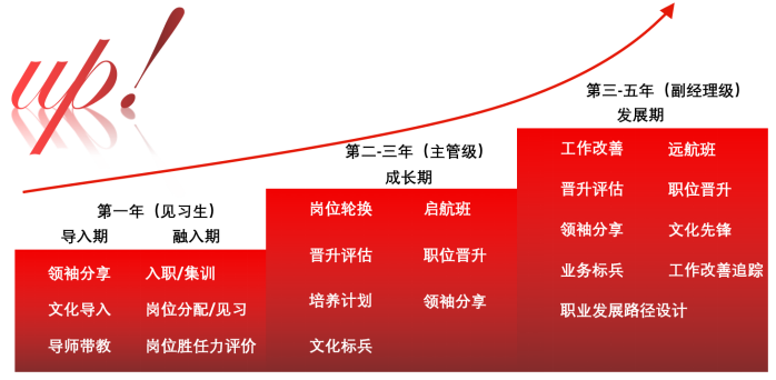 完备的培养体系:从集训-导师制-轮岗-定岗,每阶段配备导师带教,快速融入企业文化,提升职场技能;