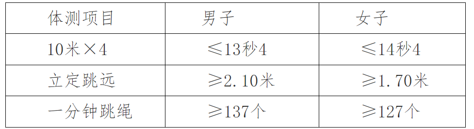 2、体能测评参考《大赢家体育印发<公安机关录用人民警察体能测评项目和标准>的通知》(公政治〔2024〕60号)规定执行,结合公安工作实际需要,体能测评内容为10米×4往返跑、立定跳远、一分钟跳绳(体能测评采取通过式、单项测评次数不超过两次),以上体能测评项目采取“三选二”的模式,由考生自主选择,具体合格标准如下:
