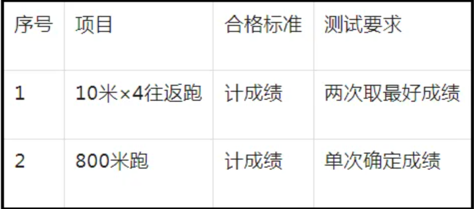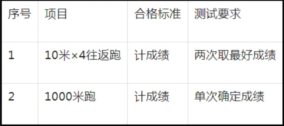 3.体能测试共设2个项目,分别为10米×4往返跑、1000米跑(女800米跑)。10米×4往返跑测评次数为2次(取最高成绩记入)、1000米跑(女800米跑)测评次数为1次。