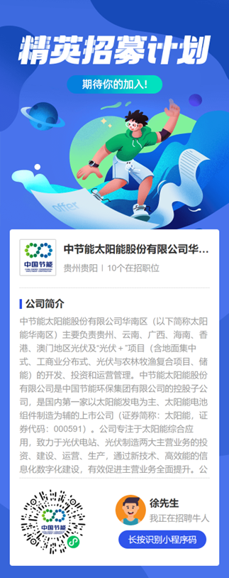 中节能太阳能股份有限公司华南区(以下简称太阳能华南区)主要负责贵州、云南、广西、海南、香港、澳门地区光伏及“光伏+”项目(含地面集中式、工商业分布式、光伏与农林牧渔复合项目、储能)的开发、投资和运营管理。中节能太阳能股份有限公司是中国节能环保集团有限公司的控股子公司,是国内第一家以太阳能发电为主、太阳能电池组件制造为辅的上市公司(证券简称:太阳能,证券代码:000591)。公司专注于太阳能综合应用,致力于光伏电站、光伏制造两大主营业务的投资、建设、运营、生产,通过新技术、高效能的信息化数字化建设,有效促进主营业务全面提升。公司具备强大的项目开发建设和运营管理能力,积累了丰富的投资经验,目前包括地面、水面、滩涂及分布式、光伏农业等多种光伏电站模式,截至目前建设规模超过6GW。公司在江苏镇江投资建设了光伏电池和组件制造基地,通过持续不断的技改升级和合作模式创新,现拥有1.5GW光伏高效电池产能和2GW高效组件产能,并积极推动高效太阳能电池及组件智能制造,努力成为行业主流高效电池制造商。公司拥有优秀的技术人才、科学的维护管理机制、完善的企业文化体系,秉承高水平的运营管理能力和“拼搏奉献、求实创新、雷厉风行、团结协作”的阳光精神,旨在成为国内一流的新能源综合利用的领军企业。