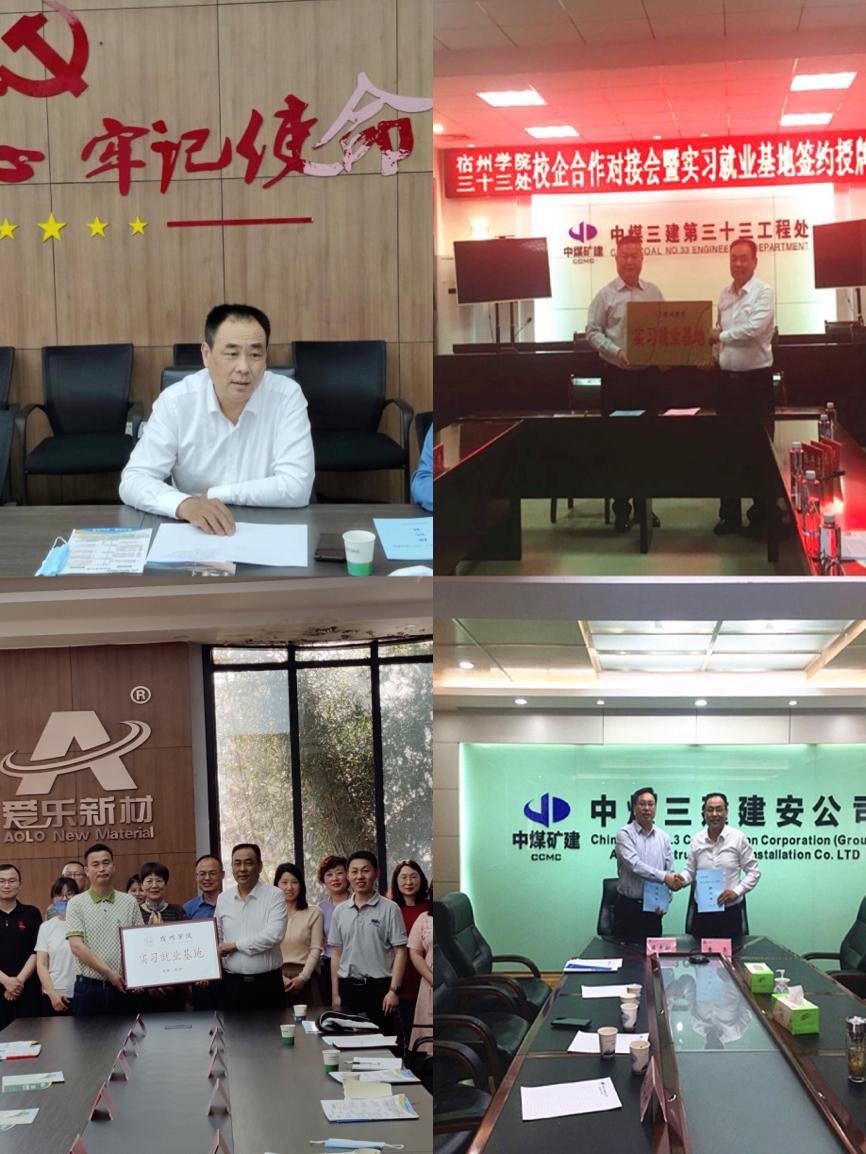 院党委委员、副院长李亮带领资源与土木工程学院、环境与测绘工程学院、数学与统计学院、文学与传媒学院、外国语学院、管理学院等先后走访了宿州现代英华学校、中煤第三建设集团旗下3个子公司、安徽淮宿建材有限公司、宿州交通文化旅游投资集团有限公司等六家企业,并分别进行了座谈与实习就业基地签约、授牌仪式,校企双方在人才培养、实习实践、创新创业、产教融合、高层次人才服务企业等方面表达了深层次合作的强烈愿景。