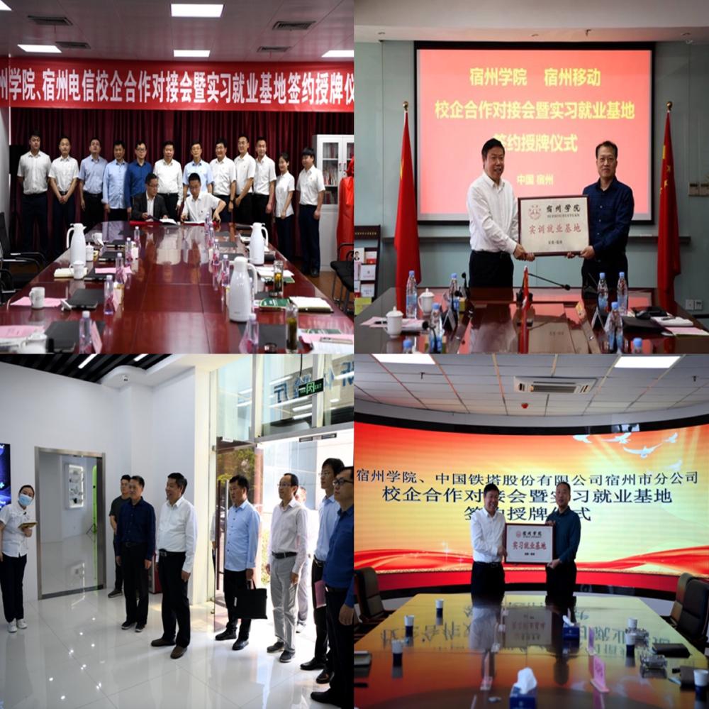 院党委书记汪刘送带领信息工程学院一行前往中国电信宿州分公司、中国移动宿州分公司、宿州华瑞网络信息服务有限公司、中国铁塔宿州分公司、中国广电安徽网络股份有限公司宿州分公司、宿州市阿尔法网络科技有限公司、安徽奇安信安全技术有限公司、云都(宿州)大数据发展有限公司等八家企业,并与八家企业负责人进行座谈。双方围绕深化校企合作、产教融合、学生顶岗实习、毕业生定向就业等合作议题开展深入交流讨论,并实地考察了企业文化、工作和生活环境,现场签订了校企合作协议书,并举行就业基地授牌仪式。