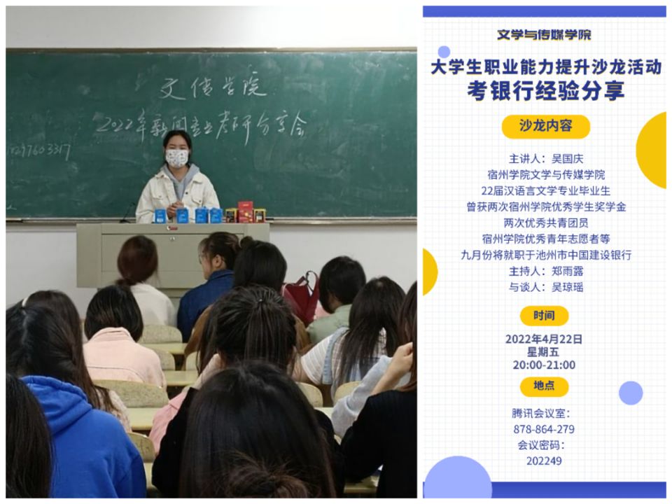 线上线下齐推进。4月中下旬,文学与传媒学院在班级、学生党支部分别开展了考研经验分享会。4月4日至今开展了系列线上就业沙龙活动,邀请了刘祥群、孙天晨、王九香、吴国庆、张浩翔等同学担任主讲,学院累计参加470人次。针对学生如何考编、考研等关心的问题进行了线上的交流和分享。