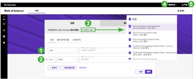 ③在下拉菜单调整检索设置:可选择核心合集中的子库等