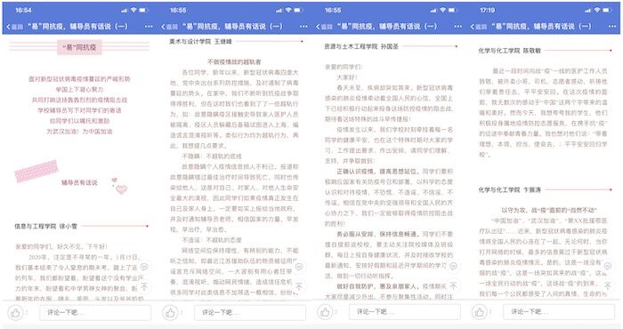 为进一步做好学生宣传教育工作,我校不仅在易班平台上宣传防控冠状病毒的知识,还利用易班平台开展“‘易’同抗疫,辅导员有话说”栏目。辅导员定期发布,以实际行动诠释初心使命,用心用情用爱引导同学们抵抗疫情。
