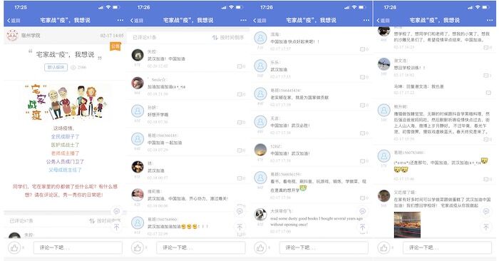 在做好教育宣传工作的同时,还关心学生在家的生活状况,《宅家战“疫”,我想说》让同学们互动交流疫情感受,在紧张的抗“疫”战争中,也能发现生活的乐趣。