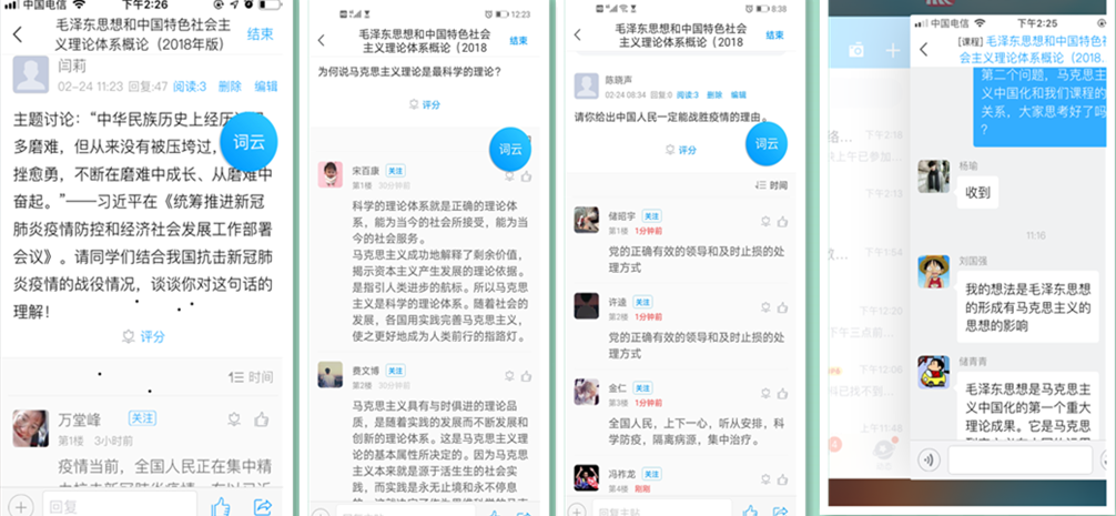 为及时掌握教学情况,进一步提升线上教学效果,学院组织人员对教学效果进行了调查。资土学院信息员反馈:项洋老师进行录屏学习,期间老师一直督促我们完成,课程语速清晰度也很好。陈晓声老师设置问题,留充足的时间给学生回答,同学都很积极的配合。余晓宏老师将作业与课件上传至“e”会学软件,避免学习通上课高峰,学习过程很顺利。文传学院信息员反馈:谷玉叶老师有序组织学委开展网课,多种视频交汇使用,非常的清楚细心。体育学院信息员反馈:叶焕勤老师督促学生看视频,耐心回答学生问题,教学质量高。美术学院信息员反馈:张敏老师的课堂讨论积极活跃,同学们都在积极发言。对于同学提的不懂问题老师耐心进行讲解。商学院信息员反馈:李世友老师,上课认真负责,对同学们耐心细心,上课效果良好,等等。通过学生信息员的反馈,了解到老师们大多应对网络可能卡顿的情况做了多种方案,以良好的状态、饱满的热情开展的思政课“空中课堂”,开学以来线上教学秩序良好,获得了广大学生较高的认可。