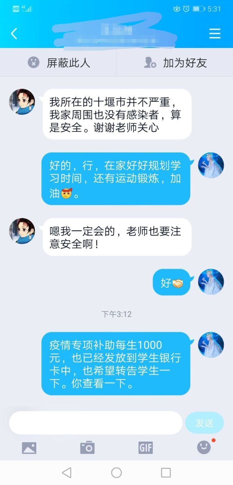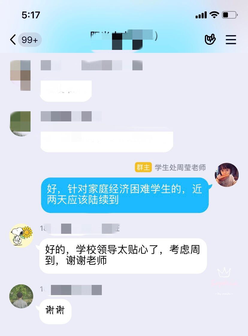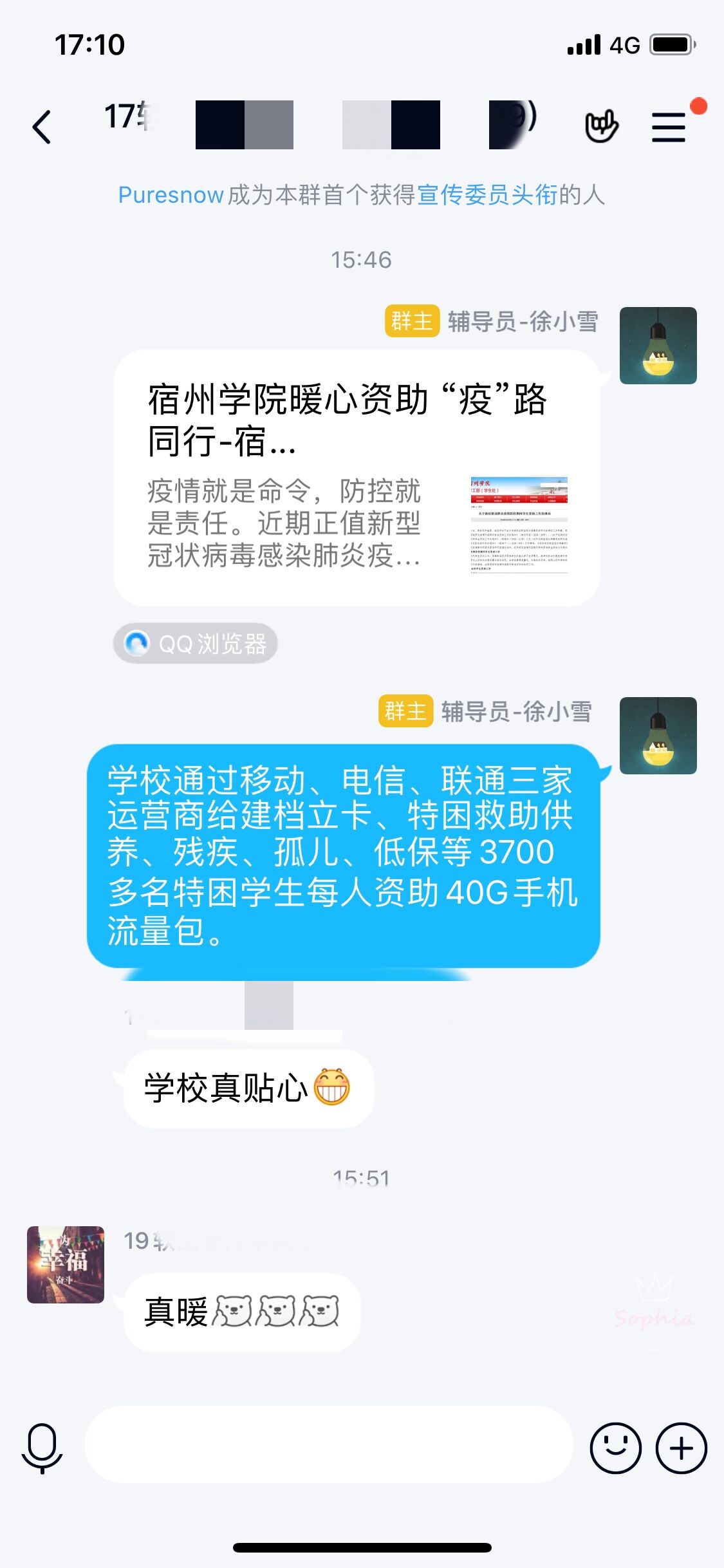 近日,学校积极落实全国教育系统应对新型冠状病毒感染肺炎疫情防控工作视频会议精神及学校在线教学工作部署要求,全面启动疫情防控期间本科网络教育教学工作。经了解,有部分学生因家中未开通网络服务功能,需使用手机数据流量进行网络课程学习。为保障家庭经济困难学生在疫情防控期间居家安心进行网络课程学习,不必为因网课学习产生相关流量费用而担忧,学校立即启动疫情防控期间学生网课流量专项资助工作,为建档立卡、低保、特困救助供养、孤儿、残疾等困难学生3779人,每人赠送40G爱心流量包,资助金额11万多元,为贫困学生参加线上教学活动提供了切实保障。18化学化工学院马兴旺说学校太贴心了,考虑周到;17金融工程承林说家里没有无线网络,真的天天用流量上网课,学校订购的流量太及时了。