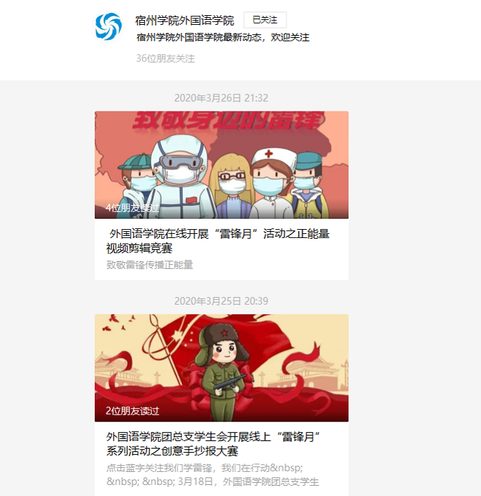 阳春三月,生机勃发。在众志成城抗击疫情的关键时期,我们迎来了第57个“学雷锋纪念日”,也是第21个“中国青年志愿者服务日”。在疫情防控这一特殊时期,校团委在全校范围内开展了2020年“学雷锋”线上主题实践活动,引领广大青年学子弘扬志愿精神,用实际行动诠释“人人为我,我为人人”的雷锋精神,让雷锋精神在宿院学子心中落地生根,开花结果。