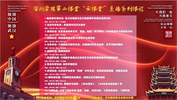 面对疫情,校团委深入贯彻“停课不停学”精神,认真落实学校防控要求,推进学生团体联合会和各类学生社团创新开展“云端第二课堂”活动,满足学生多元需求,引导其合理规划居家学习生活。