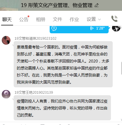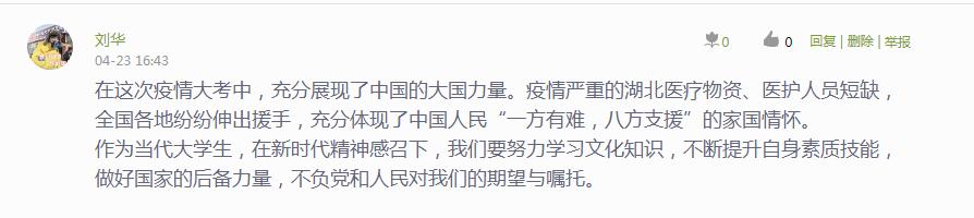 19级人力资源管理专业的高美林说:“在这场看不见敌人没有硝烟的战场上,中华民族展现出了强大的团结力量,中国人民展示了令世界震惊的奉献精神。”
