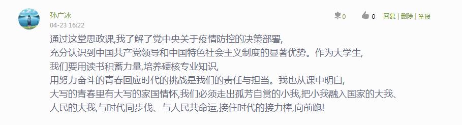 此次战“疫”思政大课,进一步深化了师生对战“疫”相关内容的认识,对进一步引导大学生传承和弘扬爱国主义精神,深刻认识中国共产党领导和中国特色社会主义制度的显著优势,深刻感悟战“疫”中彰显的中国速度、中国力量、中国精神,进一步增强“四个意识”、坚定“四个自信”、做到“两个维护”具有积极推动作用。