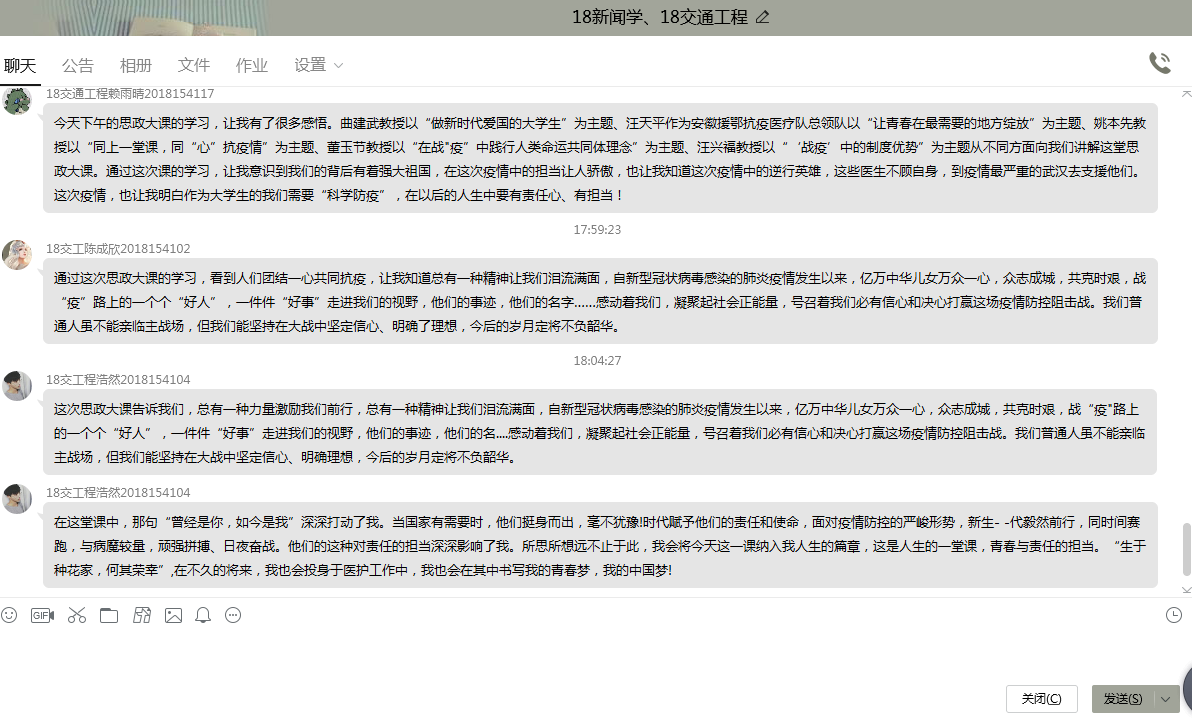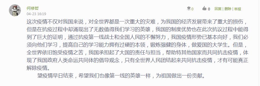 19级测绘1班的张文迪说:“作为新时代的中国青年,面对这场战疫,他们胸有大志、心有大我、肩有大任、行有大德,以青春的名义宣示了“不惧”“不退”的担当。这堂思政大课是对我们人生的引领,激励我们珍惜学习时光、练就过硬本领,回应时代呼唤,担负起时代赋予的使命和责任。”