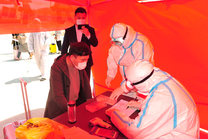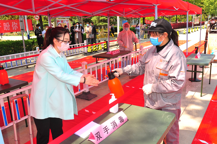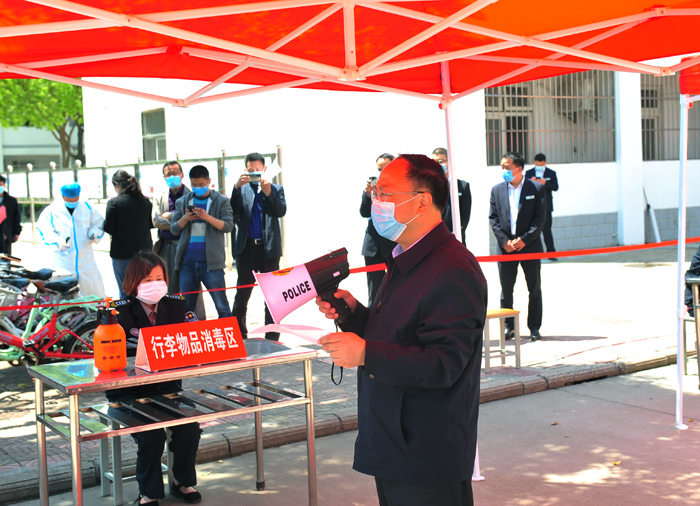 在学校南大门口演练区,“你好,请接受体温检测。温度36.5,体温正常,请通过”“你好,请扫描安康码。安康码扫描正常,请通过”“你好,请接受体温检测。温度37.5,体温异常。请后续队列暂停,引导员领至分检处接收检测,消毒人员前来消毒”类似这样的声音不断响起。学校大门的有效管控,是学校阻击疫情向校园蔓延、确保师生生命安全的第一道防线,在关键时刻发挥着关键作用。在学校南大门处,待入校学生需在校门口接受测量体温、扫安康码、足部消毒、手部消毒、行李消毒等几个步骤的检查、消毒,正常者,方可进入学校。演练现场,设置了人员进出通道2条。人员进出通道处,每一位学生在等待测温区保持1.5米距离有序排队,体温正常、无其他症状者,扫描安康码、消毒后方可进校;体温异常者,医护人员迅速将其带至临时观察点进行体温复测并登记信息。复测正常后,按照规定程序入校;复测仍然异常者,立即报告学校疫情防控领导小组,启动防疫应急处置程序,拨打120并陪送发热学生至定点医院就诊,相关人员随即对临时观察点进行消毒。