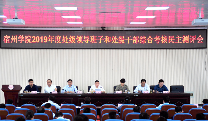 根据《大赢家体育处级领导班子和处级干部综合考核办法(试行)》和学校2019年度综合考核工作安排,5月27日,我校在逸夫楼第二会议室召开2019年度处级领导班子和处级干部综合考核民主测评会。校领导班子成员汪刘送、张莉、蔡之让、李亮、梁琦、张英彦、王俊出席会议,处级干部,省级“两代表一委员”、民主党派市级以上主委、正高级职称人员、校教代会执委等教师代表共计115人参加会议。会议由校党委书记汪刘送主持。