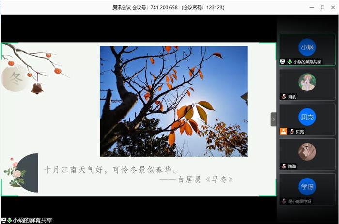经过前期的宣传,各学院积极参赛,共收到植物组作品244份,动物组作品64份。同学们紧扣“林山鸟惊飞,光影五月间”的主题进行创作。活动期间,选手们结合自己的作品在腾讯会议上进行ppt演讲,详细地向大家介绍作品的创意及背后的寓意。动物组中,活泼可爱的布偶猫、自由自在的海鸥、色彩鲜艳的鹦鹉,一幕幕的画面定格住生命的风采,展示了一个奇妙的动物世界。植物组中,高洁的菊花、夭夭的桃花、漫天飞舞的蒲公英,展现了植物蓬勃的生命力。经过评委们评选,动物组中,美术与设计学院的《寻物》等2组作品获得一等奖,生物与食品工程学院的《家有萌宠》等4组作品获得二等奖,机械与电子工程学院的《蛰伏与收获》等5组作品获得三等奖。植物组中,生物与食品工程学院的《春之切》等2组作品获得一等奖,商学院的《售卖春天》等4组作品获得二等奖,数学与统计学院的《春分》等7组作品获得三等奖。