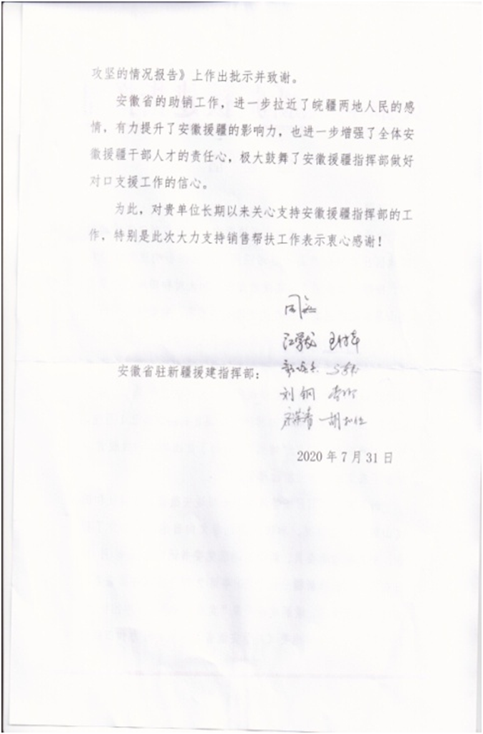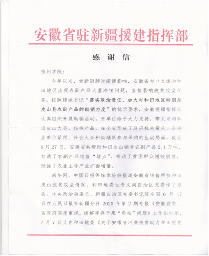 近日,省驻疆援建指挥部发来感谢信,对我校助销新疆和田地区大枣和核桃等农产品,助力脱贫攻坚表示感谢。
