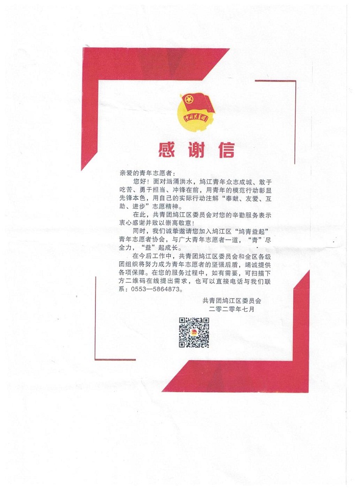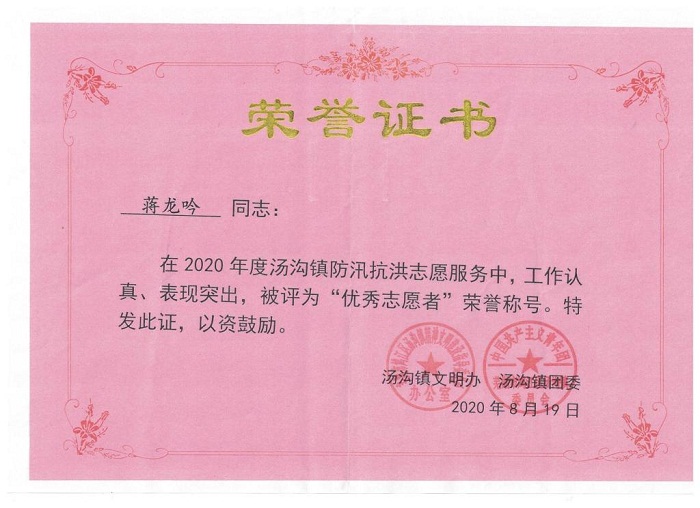 18级食品质量与安全班的学生蒋龙吟也加入到家乡汤沟镇的抗洪防汛志愿服务队伍当中,并被汤沟镇文明办、汤沟镇团委授予优秀志愿者荣誉称号。7月26日至8月10日,在为期14天的志愿服务工作当中,蒋龙吟及其所在的防汛小组,不畏风吹雨打,不惧蚊虫叮咬,日夜坚守在堤坝之上。饿了就啃方便面,渴了就喝矿泉水,寻堤的时候越是泥泞的地方越要仔细检查,一天下来鞋子沾满了於泥全部湿透,而晚上因为大坝经过白天太阳的炙烤显得空气十分的燥热,蚊虫也是呱噪扰人。