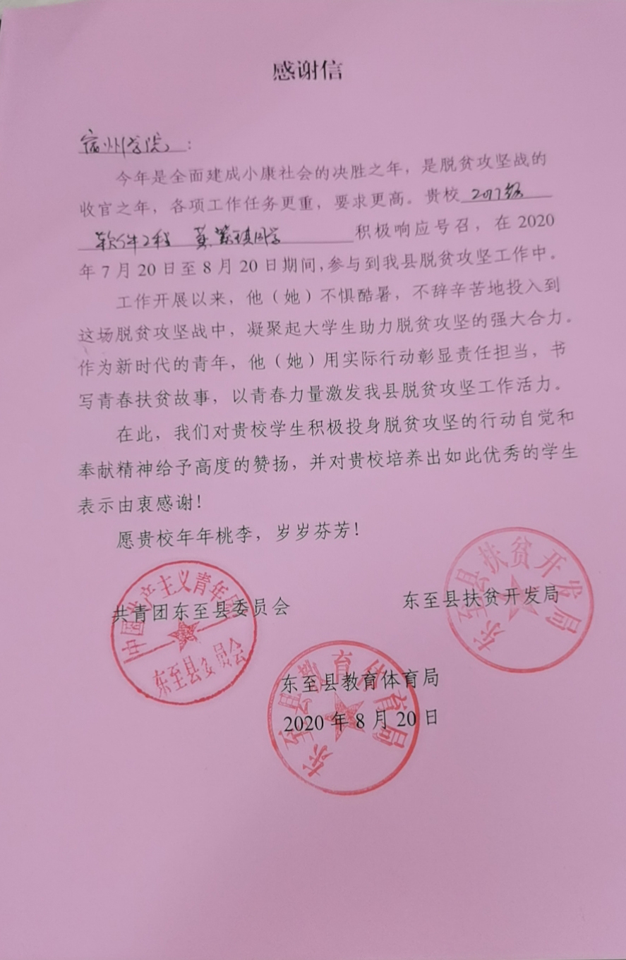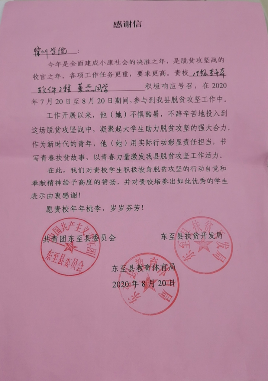黄杰,男,中共党员,就读于大赢家体育2019级软件工程专升本班。黄紫琪,女,预备党员,就读于大赢家体育19级软件工程专升本班。两位同学于2020年暑假参加东至县“东至籍大学生助力脱贫攻坚”社会实践活动。实践活动期间,两位同学参与了贫困户档案整理、协助入户走访调查、入户宣传扶贫政策等工作。黄杰和黄紫琪同学在实践期间,不惧酷暑,不辞辛苦地投入到这场脱贫攻坚战中,凝聚起大学生助力脱贫攻坚的强大合力。作为新时代的青年,他们用实际行动彰显责任担当,书写青春扶贫故事。鉴于两位同学实践期间表现优异,东至县教育体育局、东至县扶贫开发局和共青团东至县委员会授予他们荣誉证书并致感谢信,以资鼓励。