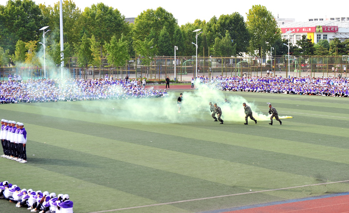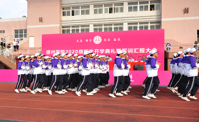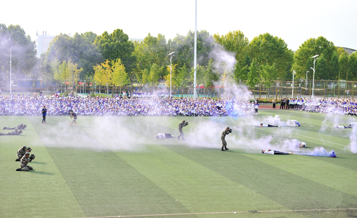 为检验我校2020级新生军训成果,获得军训会操第一名的班级做了汇报表演。同学们迈着整齐的步伐,喊着响亮的口号,以饱满的精神、昂扬的斗志展示了军训的丰硕成果。国旗护卫队也进行了精彩的表演,武警宿州支队的教官进行了擒敌技能和反恐战术演练。精彩的表演和演练赢得了同学们的阵阵掌声和喝彩声。