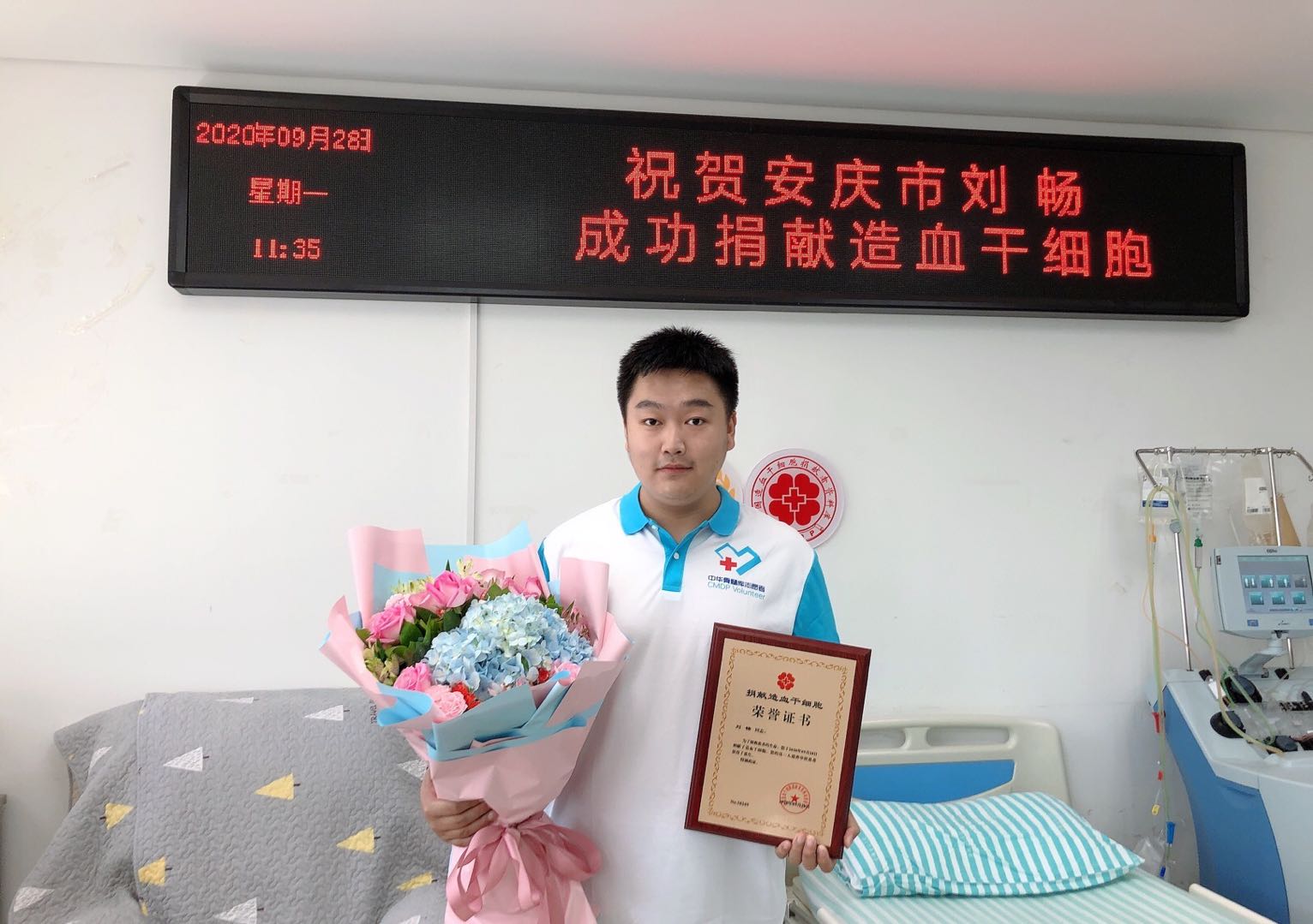 现年21岁的刘畅于2016年考入我校,就读于外国语学院英语专业,2020年7月毕业,目前是岳西县交通运输局的一名见习生。2018年3月22日,在大赢家体育组织的无偿献血活动中,刘畅参加献血并采集血样加入了中华骨髓库。2020年8月,他接到安徽省红十字会的通知,他与一名9岁患再生障碍性贫血的小女孩初步配型成功,并征询他的捐献意愿。得知消息后,他欣然同意捐献造血干细胞,并在家人和单位的大力支持下,积极做好各项准备工作。9月23日,岳西县红十字会为刘畅举行欢送会,并送他入住中国科技大学附属第一医院(安徽省立医院),刘畅也成为岳西县首例造血干细胞捐献者。在注射9针动员剂后,于28日经过近三个小时采集了216ml的造血干细胞混悬液。随即这袋带着捐献者体温的“生命的种子”搭乘高铁送往患者所在的医院,将大爱传递到患者的体内。