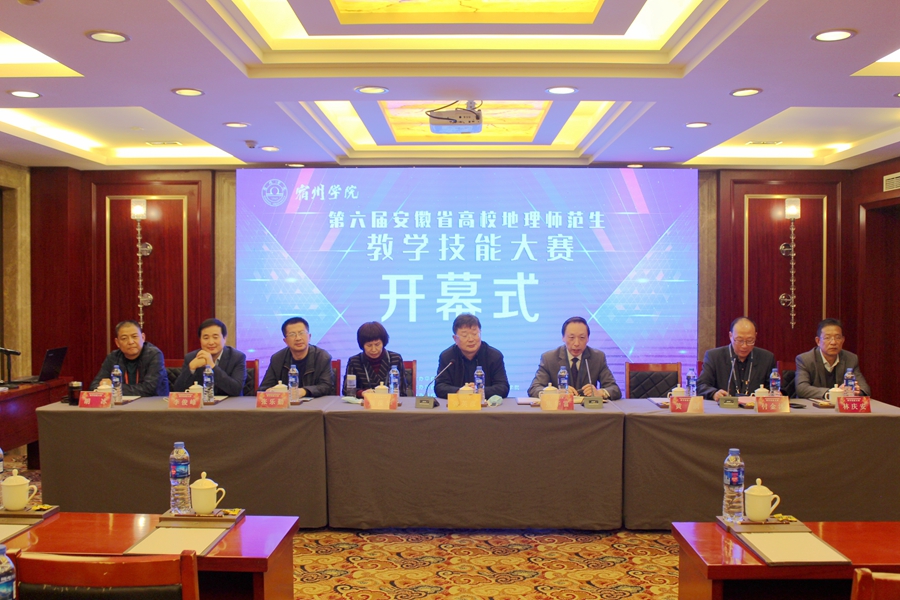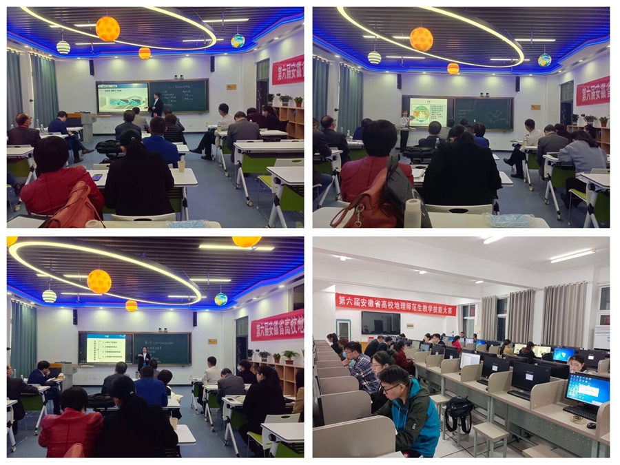 本次比赛内容包括1标准课时教学设计(含课件制作)、15分钟模拟上课和5分钟现场答辩三个环节构成,比赛分别在地理师范技能中心主会场和宿州国际大酒店线上分会场举行,大赛评委由高校地理系教师、中学一线优秀地理教师组成。