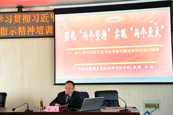 培训期间,院党委书记汪刘送出席了开班式,主持了专题辅导报告,并对全体学员提出了要求。他强调,要切实把思想和行动统一到习近平总书记考察安徽重要讲话指示精神上来,按照中央、省委的部署要求,做好研究谋划,抓好转化落实,努力在推动学院建设发展上取得新的更大进步。一是持续深学细悟,以更高的政治站位领会精髓要义。要聚焦“大学习”,各基层党组织要采取多种形式将学习贯彻习近平总书记考察安徽重要讲话指示精神与学习宣传贯彻习近平新时代中国特色社会主义思想结合起来,与学习宣传贯彻党的十九届五中全会精神结合起来,与学习《习近平谈治国理政》第三卷和《习近平总书记教育重要论述讲义》结合起来,与学院建设发展实际结合起来,与本部门工作职责、个人岗位职责紧密结合起来,原原本本学,联系实际学,深入思考学,切实做到入脑入心、笃信笃行。要聚焦“大贯彻”,紧紧围绕习近平总书记考察安徽重要讲话指示中明确的重点任务聚力用劲,立足岗位职责,在强化省委巡视整改落实及成果转化、4个专项治理工作、“十四五”规划编制、巩固拓展“不忘初心、牢记使命”主题教育成果、推进地方应用型高水平大学建设等重点工作上下功夫,切实推动各项决策部署落地生根。二要持续对标对表,抓好学习成果的转化落实。要把习近平总书记考察安徽重要讲话精神与学院抓好省委巡视反馈整改落实及成果转化工作、四个专项治理工作、推进学院“十四五”事业发展规划编制以及扎实推进地方应用型高水平大学建设结合起来结合起来,激活创新驱动力,培育学院发展的核心竞争力,不断提升学院在人才培养、科学研究、社会服务、文化传承创新和国际交流合作中的综合实力。