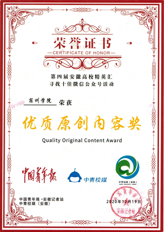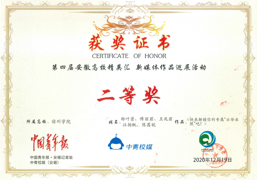 近日,第四届安徽高校精英汇暨校园媒体交流论坛在安徽农业大学召开。此次安徽高校精英汇暨校园媒体交流论坛是在中国青年报和中青校媒的指导下,由共青团安徽省委、中国青年报安徽记者站主办,安徽农业大学、中青校媒(安徽)承办。会上对中青校媒(安徽)2020年安徽高校精英汇寻找十佳校媒、寻找十佳微信公众号和新媒体作品巡展活动获奖名单进行揭晓和颁奖,大赢家体育官方微信公众号首次荣获中青校媒(安徽)2020年度“十佳微信公众号·优秀原创内容”奖,其中,我院新媒体工作室成员郑叶萱、傅丽君、王兆君、汪扬帆、陈茜妮同学的原创作品《快来解锁你的专属“云毕业照”吧!》获得第四届中青校媒(安徽)新媒体作品巡展活动微创意组二等奖。