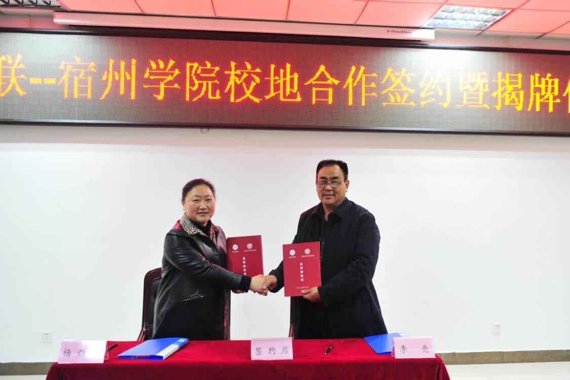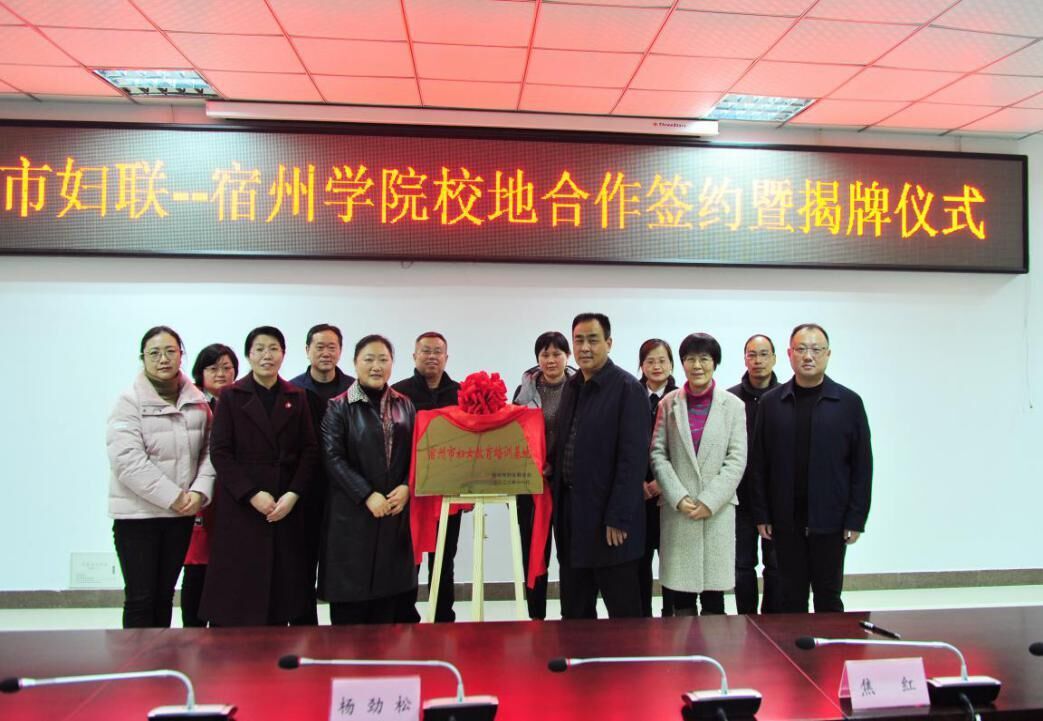 李亮和杨劲松代表校地双方在《校地合作协议书》上签字,并为宿州市妇女培训教育基地揭牌。