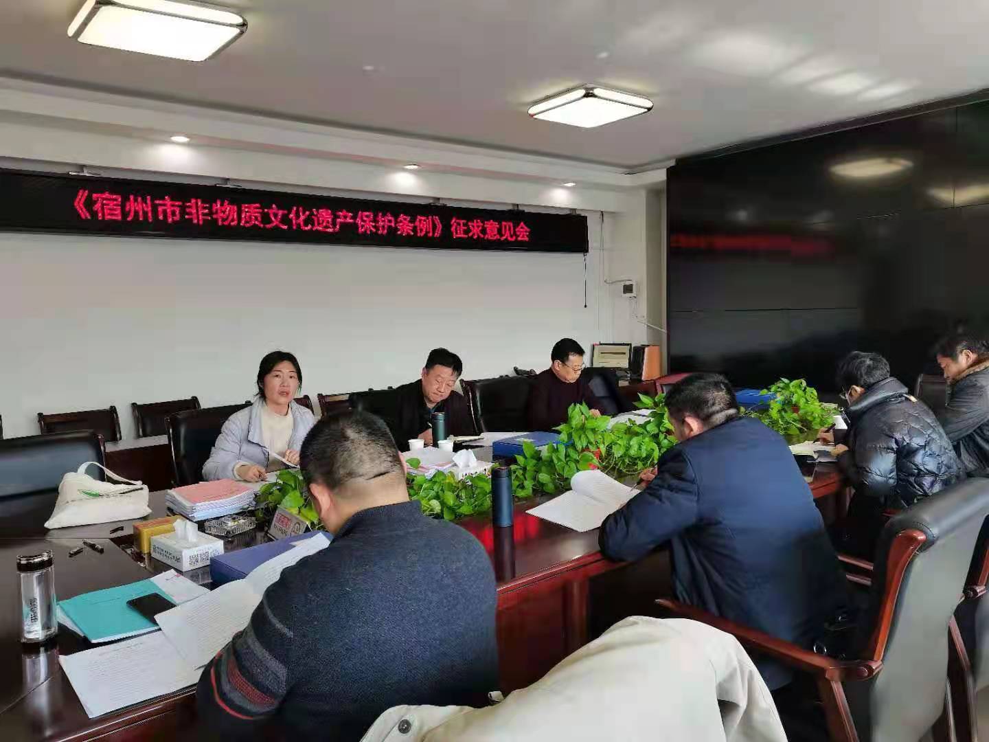 会上,宿州市文化和旅游局副局长卢超对宿州市非物质文化遗产立法起草的过程,《条例》的框架进行了汇报,陈艳博士对该《条例》的重点问题进行了解读。各相关部门对《条例》的内容进行了热烈的讨论,项目组老师对会上各部门提出的问题进行了一一解答。会后,《条例》根据各部门反馈意见进行了斟酌、修改,并公开到政府网站,以广泛征求社会各界意见。