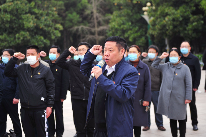 上午十点,苍松翠柏掩映着的革命烈士纪念碑巍然耸立,党员代表首先向革命烈士纪念碑敬献了花篮,全体党员领导干部怀着崇敬的心情,鞠躬致敬,深切表达缅怀之情。随后,在汪刘送的带领下,全体党员领导干部重温了入党誓词,对着党旗庄严宣誓,表达了不忘初心,牢记使命,永远跟党走的坚定信念。