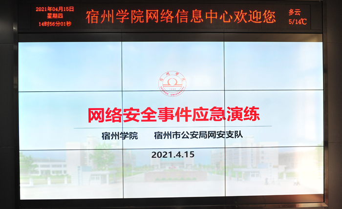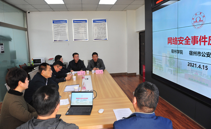 为进一步提升我院网络安全应急处置能力及协作水平,营造安全稳定的校园网络环境,在4月15日第六个全民国家安全教育日来临之际,我院与宿州市公安局网安支队在教育园区校区逸夫楼“智慧校园运维服务中心”共同开展了2021年上半年网络安全应急演练。宿州市公安局网安支队相关领导,院党委委员、副院长李亮,宣传部、保卫处、办公室(网络与信息中心)等部门负责人及工作人员参加了应急演练,应急演练由办公室主任李高主持。