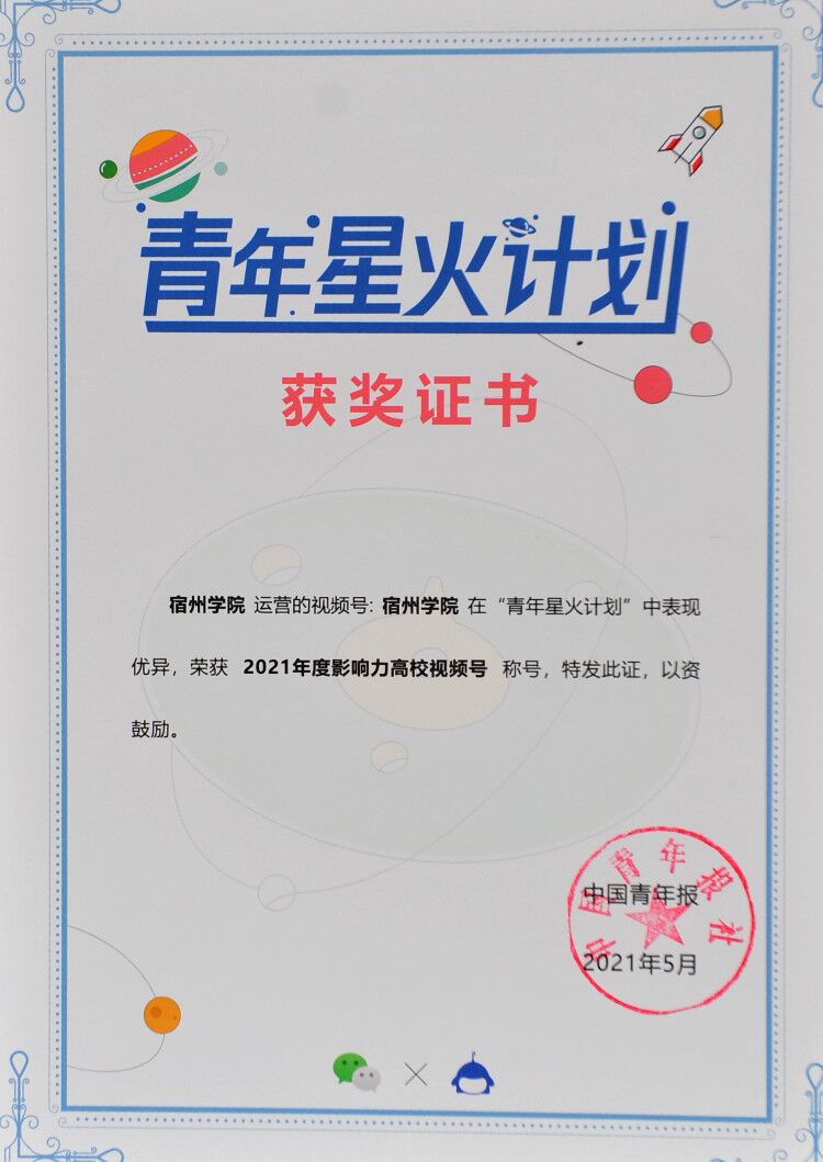2021年5月7日,由中国青年报社、中青校媒和腾讯微信团队共同发起的“创造正当年——青年星火计划”2021高校视频号创造营在深圳举办,上百所高校的老师、同学齐聚活动现场分享高校视频号创作经验。我院荣获“2021年度影响力高校视频号”称号。