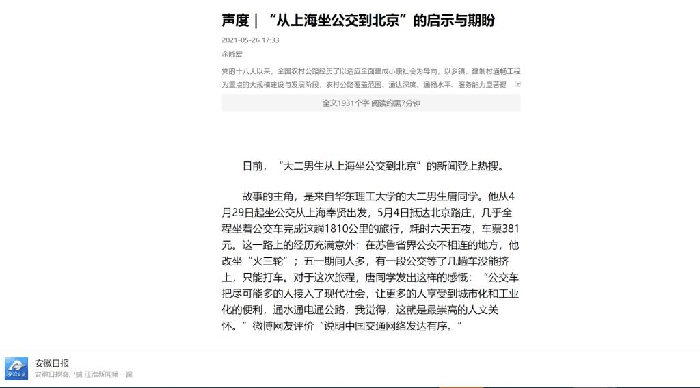 近日,安徽日报思想理论周刊刊发我院马克思主义学院余晓宏副教授题为“从上海坐公交到北京的启示与期盼”文章。文章以“大二男生从上海坐公交到北京”说明中国公路设施的发展,特别是农村公路建设的成效。文章指出,习近平总书记部署的“四好农村路”建设是一项民生工程、民心工程、德政工程,便捷的是交通,通达的是财富,连接的是民心,巩固的是党在农村的执政基础;改革发展成果更多更公平地惠及全体人民,不断增强人民群众的交通获得感、幸福感、安全感。