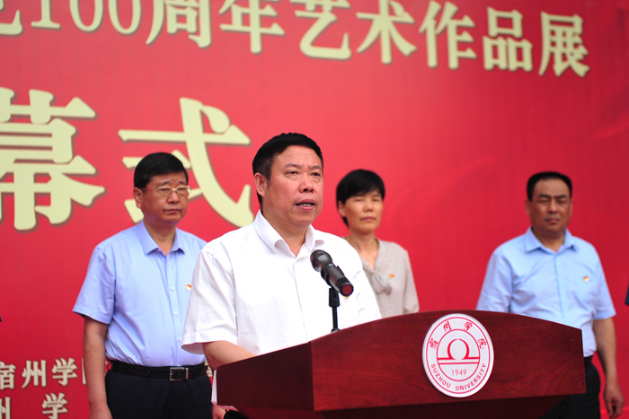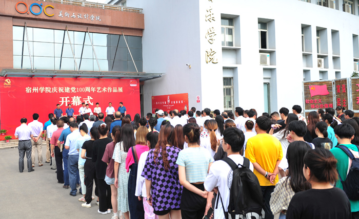 党史学习教育省委第四巡回指导组组长、淮北市人大常委会主任方宗泽,巡回指导组成员、淮北市人大常委会研究室副主任周金群、合肥师范学院外国语学院副科级辅导员江洋,院领导汪刘送、张莉、蔡之让、李亮、张英彦、王俊出席艺术作品展开幕式,院党委书记汪刘送在开幕式上致辞,院党委理论学习中心组全体成员、各单位党政主要负责人、学生代表参加开幕式。汪刘送在开幕式上指出,红色艺术作品依托丰富的历史素材,运用绘画、书法等再现党史上的重大事件、杰出人物及其英雄事迹,生动地再现建党百年的光辉历程。红色艺术作品应为国家、为人民而作,以美为体,以史为魂,融党史题材和艺术之美于一体,是党史学习教育的重要载体。希望全院师生能够从这些展览的作品中汲取精神力量,砥砺奋进谋发展,乘风破浪开新局,同心协力建设特色鲜明的应用型高水平大学,为新阶段现代化美好安徽建设作出积极贡献,以优异成绩庆祝建党100周年。