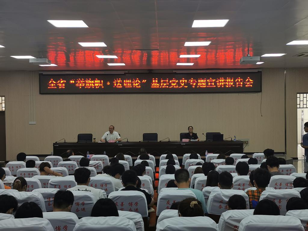 6月16日,全省“举旗帜•送理论”基层党史专题宣讲报告会在我校逸夫楼第二会 议室举行。安徽省委讲师团成员,省妇联办公室四级调研员许月明作宣讲报告,院团委书记凌峰主持会议,宣传部、工会负责同志以及校“青马工程”学员300余人聆听报告。