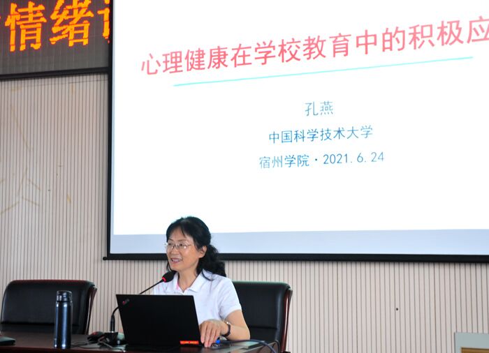 6月24日上午,中国科技大学心理学系执行主任、博士生导师孔燕教授应我院邀请,在逸夫楼第二会议室作了主题为《高校教师压力管理与情绪调节》的心理健康教育专题报告会。报告会由张英彦校长主持,全院科级干部及二级学院辅导员和教师聆听了讲座。