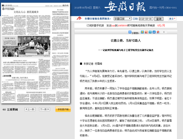 切实发挥典型人物的示范引领作用。我院机械与电子工程学院党委副书记、纪委书记杨杰长期坚持献血,并于2018年初捐献造血干细胞,成为安徽省高校首位造血干细胞捐献者。杨杰先后获得“宿州好人”、“安徽好人”、安徽省“最美家庭”、2018-2019年度全国无偿献血志愿服务奖等荣誉称号。张琼丽同学于2019年捐献造血干细胞,获“宿州好人”和安徽省“优秀大学生”称号。2020届毕业生刘畅同学于2020年11月捐献造血干细胞。学院积极挖掘、报道典型人物的先进事迹,引导广大师生见贤思齐,向他们学习。在做好校内宣传的同时,学院积极向外界宣传他们的先进事迹,安徽日报、中安在线等多家媒体对他们的优秀事迹进行了报道,受到社会各界的一致好评。
