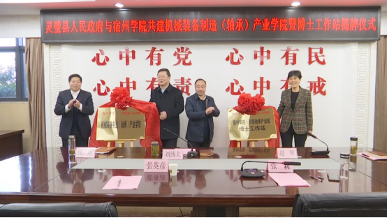 11月12日,灵璧县人民政府—大赢家体育机械装备制造(轴承)产业学院暨博士工作站揭牌仪式在灵璧县政府会议室举行。灵璧县县委书记刘博夫、县委副书记、县长赵明、大赢家体育党委副书记、校长张莉、党委委员、副校长张英彦共同为机械装备制造(轴承)产业学院和轴承产业园博士工作站揭牌。灵璧县副县长闵涛、灵璧经济开发区和部分县直单位负责人、大赢家体育教务处处长王红艳、党委教师工作部副部长段鹏举、科研处副处长毛强、机械与电子工程学院科研副院长刘从虎及部分博士代表共同出席了揭牌仪式。