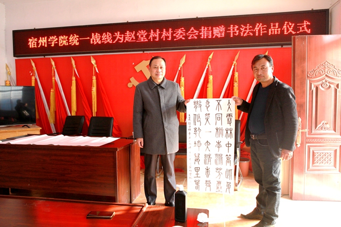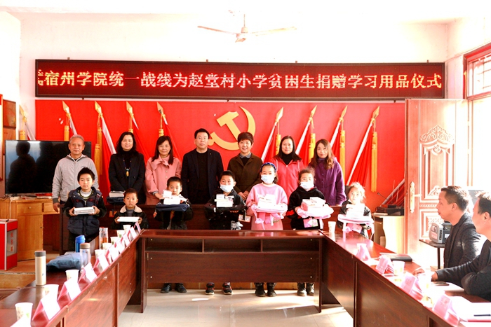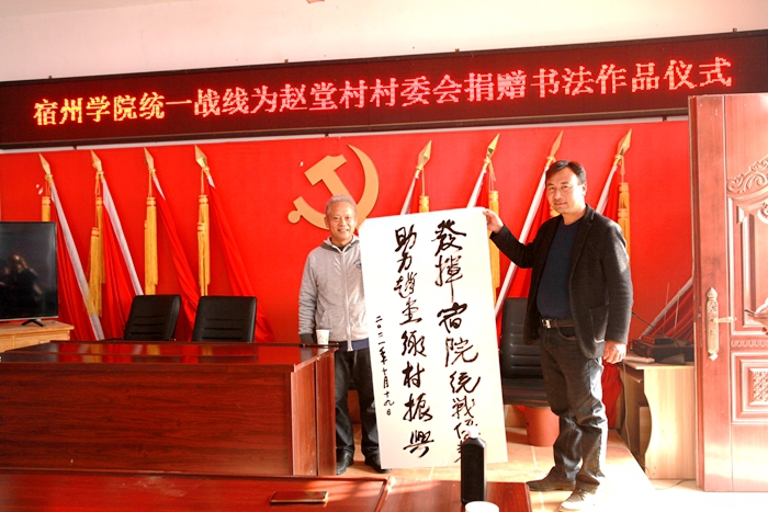 在赵堂村村委会,党委统战部部长李真、九三学社宿州市副主委方雪梅、民盟宿州市总支主委唐永刚、民进大赢家体育支部主委张素枝、农工党党员、市政协委员曹少飞、知联会会长单玲玲、侨联代表崔琳等还向赵堂村小学生捐赠了红色读物、书包、文具盒、作业本等学习用品,并鼓励孩子们努力学习、健康成长,用优异的成绩回报社会和家乡,不辜负大家的殷切希望。民盟大赢家体育支部主委傅华辰、曹少飞还现场泼墨挥毫,向赵堂村捐赠了书法作品。