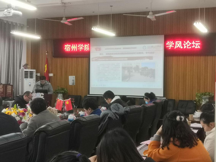 化学与化工学院副院长王聪介绍学院“6抓5促1营造”的学风建设措施,即以文化育学风、以教学带学风、以管理正学风、以考风严学风、以活动促学风、以榜样树学风。通过不断加强课程思政,推动“三全育人”,搭建素质能力培养平台,服务学生,提升竞争力。马克思主义学院副院长唐伟元以“发挥好思政课主渠道作用”为主题,提出加强思政课教学质量,打造思政“金课”,提高教学效果。注重实践育人,积极组织学生参加社会实践活动,引导学生树立正确的世界观、人生观、价值观,促进教风、学风建设。