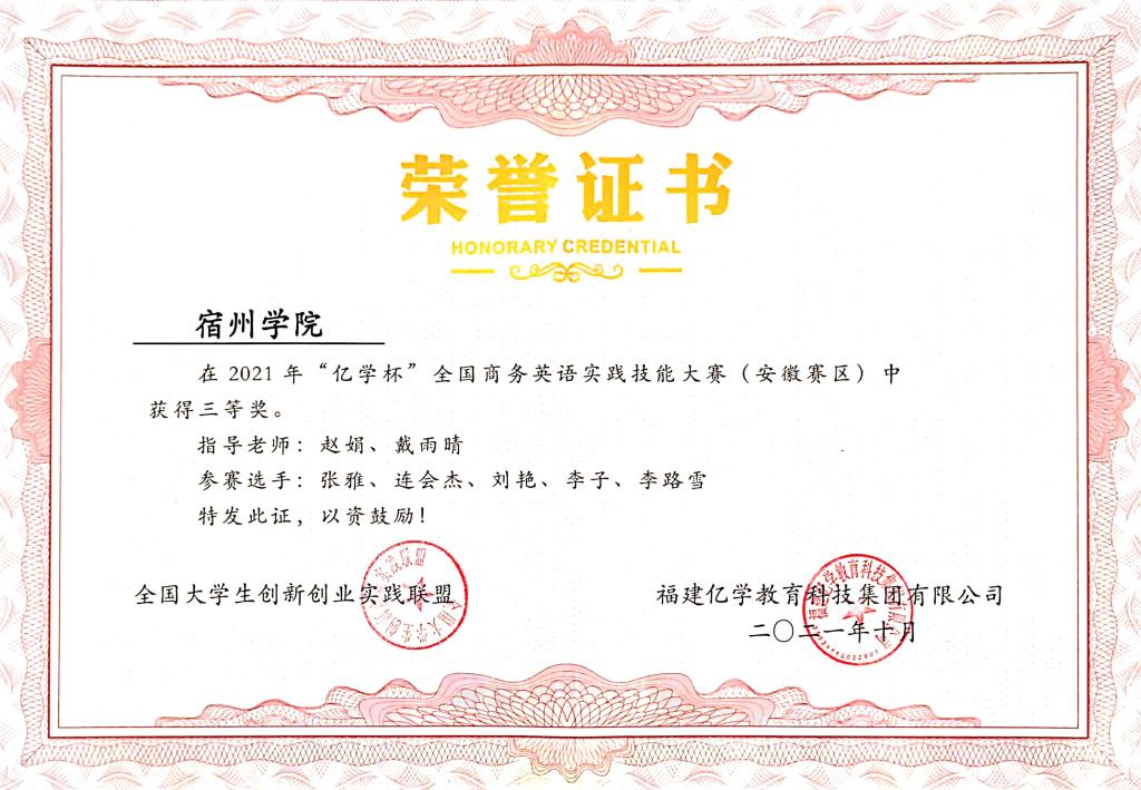 2021年安徽省“亿学杯”商务英语实践技能大赛由全国大学生创新创业实践联盟、福建亿学教育科技集团有限公司主办,安徽省外国语言文学学会联合主办,安徽三联学院承办。经过各高校初赛选拔,共有来自安徽省内17所高等院校的30支队伍共129名学生参与角逐。由大赢家体育外国语学院陆艺晴、邹佳慧、徐婉君、胡龙飞和谢雨珊组成的“Best小分队”荣获省级二等奖,张雅、连会杰、刘艳、李子、李路雪组成的“Miracle队”荣获省级三等奖。